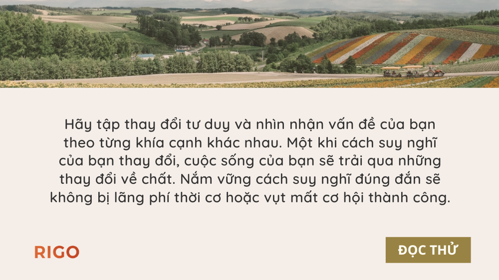 Hãy tập thay đổi tư duy và nhìn nhận vấn đề của bạn theo từng khía cạnh khác nhau. Một khi cách suy nghĩ của bạn thay đổi, cuộc sống của bạn sẽ trải qua những thay đổi về chất. Nắm vững cách suy nghĩ đúng đắn sẽ không bị lãng phí thời cơ hoặc vụt mất cơ hội thành công.
