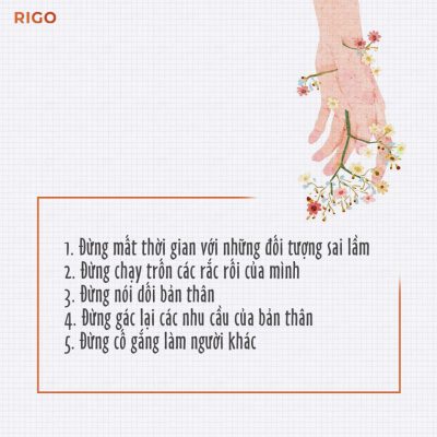 1. Đừng mất thời gian với những đối tượng sai lầm 2. Đừng chạy trốn các rắc rối của mình 3. Đừng nói dối bản thân 4. Đừng gác lại các nhu cầu của bản thân 5. Đừng cố gắng làm người khác