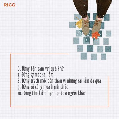6. Đừng bận tâm với quá khứ 7. Đừng sợ mắc sai lầm 8. Đừng trách móc bản thân vì những sai lầm đã qua 9. Đừng cố công mua hạnh phúc 10. Đừng tìm kiếm hạnh phúc ở người khác