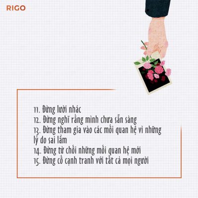 11. Đừng lười nhác 12. Đừng nghĩ rằng mình chưa sẵn sàng 13. Đừng tham gia vào các mối quan hệ vì những lý do sai lầ 14. Đừng từ chối những mối quan hệ mới 15. Đừng cố cạnh tranh với tất cả mọi người