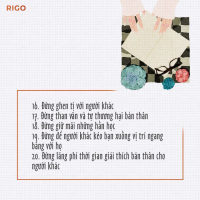 16. Đừng ghen tị với người khác 17. Đừng than vãn và tự thương hại bản thân 18. Đừng giữ mãi những hằn học 19. Đừng để người khác kéo bạn xuống vị trí ngang bằng với họ 20. Đừng lãng phí thời gian giải thíchbarnn thâ cho người khác