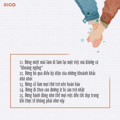 21. Đừng miệt mài là đi làm lại một việc mà không có “khoảng ngừng” 22. Đừng bỏ qua điều kỳ diệu của những khoảnh khắc nhỏ nhoi 23. Đừng cố là mọi thứ trở nên hoàn hảo 24. Đừng đi theo con đường ít bị cản trở nhất 25. Đừng hành động như thể mọi việc đều tốt đẹp trong khi thực tế không phải vậy.
