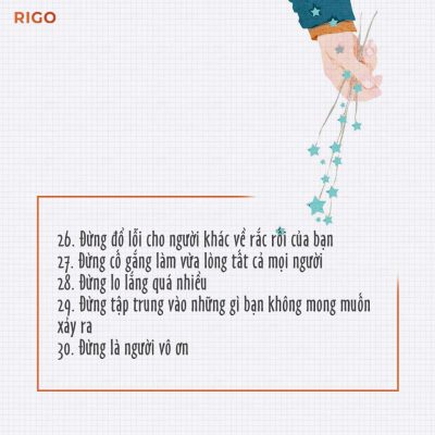 26. Đừng đổ lỗi cho người khác về rắc rối của bạn 27. Đừng cố gắng làm vừa lòng tất cả mọi người 28. Đừng lo lắng quá nhiều 29. Đừng tập trung và những gì bạn không mong muốn xảy ra 30. Đừng là người vô ơn Nếu bạn thấy hữu ích, hãy chia sẻ