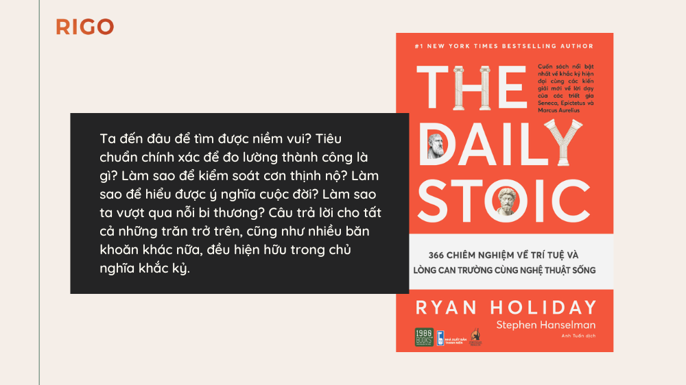 “Cuốn sách là dòng suối tri thức đầy thực tiễn, giúp bạn tập trung vào những điều nằm trong tầm kiểm soát của bạn, để loại bỏ những quan điểm sai lầm và hạn chế tiềm năng, qua đó có thể hành động hợp lý và hiệu quả hơn. Hãy biến The Daily Stoic thành cẩm nang của mình và bạn sẽ sống sáng suốt, ý nghĩa và thanh thản hơn mỗi ngày!”