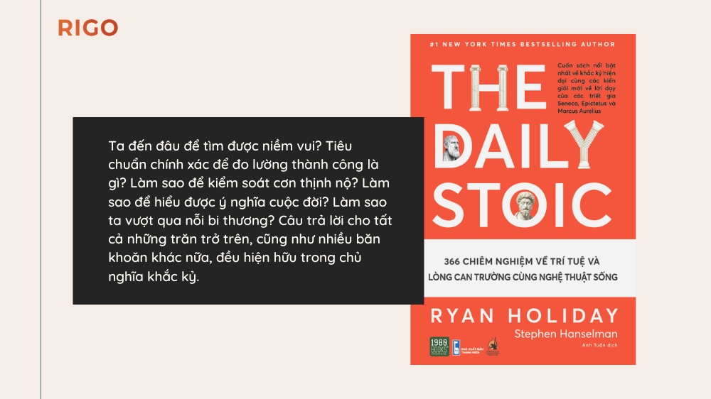 “Cuốn sách là dòng suối tri thức đầy thực tiễn, giúp bạn tập trung vào những điều nằm trong tầm kiểm soát của bạn, để loại bỏ những quan điểm sai lầm và hạn chế tiềm năng, qua đó có thể hành động hợp lý và hiệu quả hơn. Hãy biến The Daily Stoic thành cẩm nang của mình và bạn sẽ sống sáng suốt, ý nghĩa và thanh thản hơn mỗi ngày!”