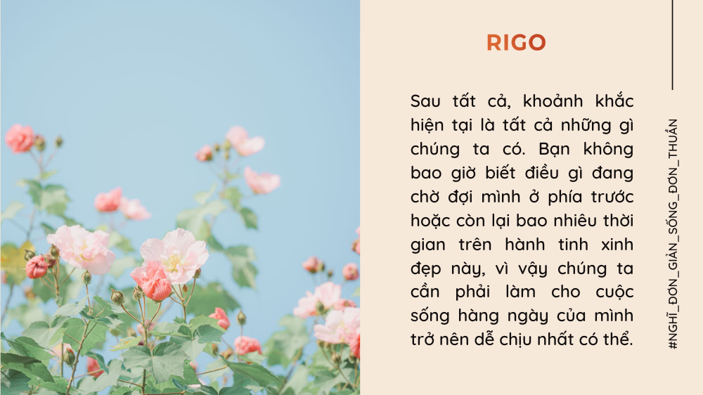 Sau tất cả, khoảnh khắc hiện tại là tất cả những gì chúng ta có. Bạn không bao giờ biết điều gì đang chờ đợi mình ở phía trước hoặc còn lại bao nhiêu thời gian trên hành tinh xinh đẹp này, vì vậy chúng ta cần phải làm cho cuộc sống hàng ngày của mình trở nên dễ chịu nhất có thể.