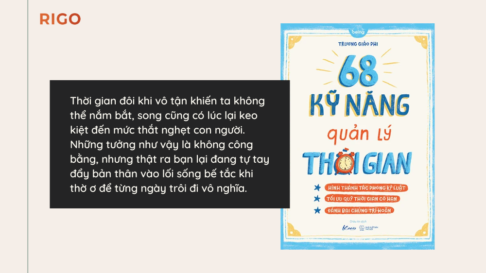 Ai cũng chỉ có vỏn vẹn 24 tiếng mỗi ngày, thế mà người thì hoàn thành đúng kế hoạch và tận hưởng cuộc sống, người thì bận rộn đến kiệt sức cũng không đạt được gì cả. Thời gian đôi khi vô tận khiến ta không thể nắm bắt, song cũng có lúc lại keo kiệt đến mức thắt nghẹt con người. Những tưởng như vậy là không công bằng, nhưng thật ra bạn lại đang tự tay đẩy bản thân vào lối sống bế tắc khi thờ ơ để từng ngày trôi đi vô nghĩa.