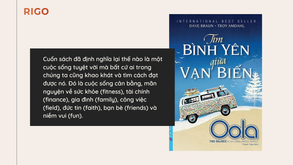 Cuốn sách “Oola – Tìm bình yên giữa vạn biến” đã định nghĩa lại thế nào là một cuộc sống tuyệt vời mà bất cứ ai trong chúng ta cũng khao khát và tìm cách đạt được nó. Đó là cuộc sống cân bằng, mãn nguyện về sức khỏe (fitness), tài chính (finance), gia đình (family), công việc (field), đức tin (faith), bạn bè (friends) và niềm vui (fun).
