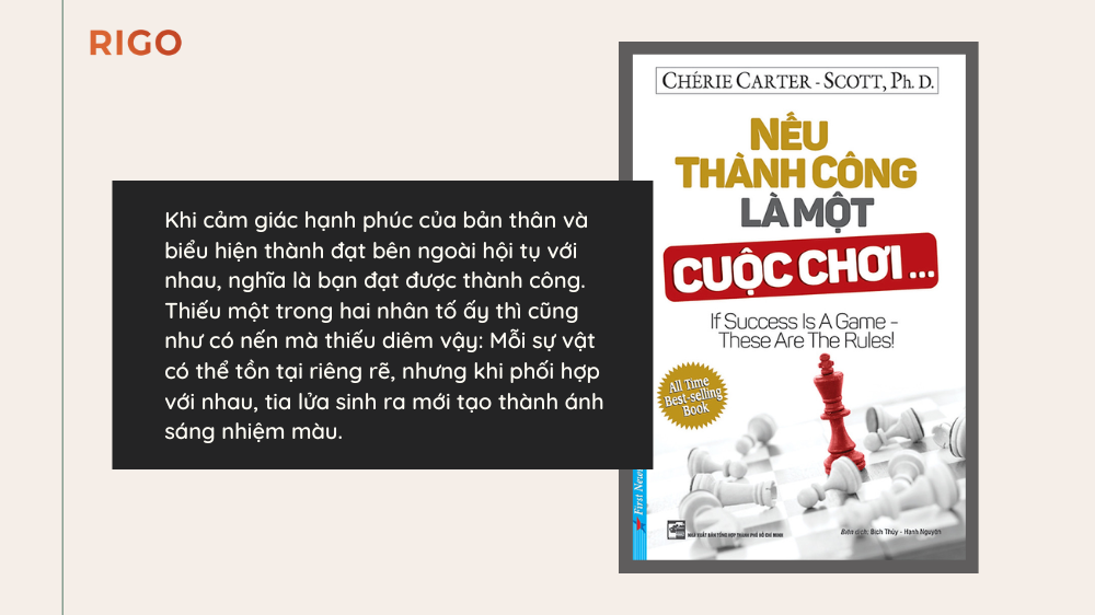 Khi cảm giác hạnh phúc của bản thân và biểu hiện thành đạt bên ngoài hội tụ với nhau, nghĩa là bạn đạt được thành công. Thiếu một trong hai nhân tố ấy thì cũng như có nến mà thiếu diêm vậy: Mỗi sự vật có thể tồn tại riêng rẽ, nhưng khi phối hợp với nhau, tia lửa sinh ra mới tạo thành ánh sáng nhiệm màu.