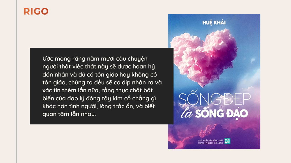 Ước mong rằng năm mươi câu chuyện người thật việc thật này sẽ được hoan hỷ đón nhận và dù có tôn giáo hay không có tôn giáo, chúng ta đều sẽ có dịp nhận ra và xác tín thêm lần nữa, rằng thực chất bất biến của đạo lý đông tây kim cổ chẳng gì khác hơn tình người, lòng trắc ẩn, và biết quan tâm lẫn nhau.