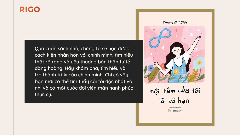 Qua cuốn sách nhỏ, chúng ta sẽ học được cách kiên nhẫn hơn với chính mình, tìm hiểu thật rõ ràng và yêu thương bản thân tử tế đàng hoàng. Hãy khám phá, tìm hiểu và trở thành tri kỉ của chính mình. Chỉ có vậy, bạn mới có thể tìm thấy cái tôi độc nhất vô nhị và có một cuộc đời viên mãn hạnh phúc thực sự.