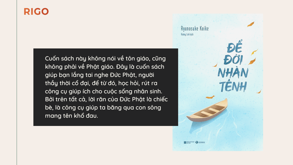 Cuốn sách này không nói về tôn giáo, cũng không phải về Phật giáo. Đây là cuốn sách giúp bạn lắng tai nghe Đức Phật, người thầy thời cổ đại, để từ đó, học hỏi, rút ra công cụ giúp ích cho cuộc sống nhân sinh. Bởi trên tất cả, lời răn của Đức Phật là chiếc bè, là công cụ giúp ta băng qua con sông mang tên khổ đau.