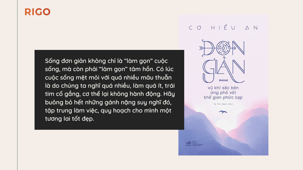 Sống đơn giản không chỉ là “làm gọn” cuộc sống, mà còn phải “làm gọn” tâm hồn. Có lúc cuộc sống mệt mỏi với quá nhiều mâu thuẫn là do chúng ta nghĩ quá nhiều, làm quá ít, trái tim cố gắng, cơ thể lại không hành động. Hãy buông bỏ hết những gánh nặng suy nghĩ đó, tập trung làm việc, quy hoạch cho mình một tương lai tốt đẹp.