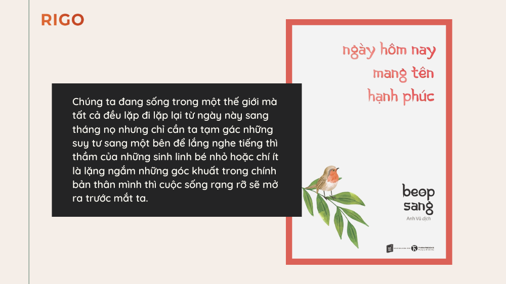 Chúng ta đang sống trong một thế giới mà tất cả đều lặp đi lặp lại từ ngày này sang tháng nọ nhưng chỉ cần ta tạm gác những suy tư sang một bên để lắng nghe tiếng thì thầm của những sinh linh bé nhỏ hoặc chí ít là lặng ngắm những góc khuất trong chính bản thân mình thì cuộc sống rạng rỡ sẽ mở ra trước mắt ta.