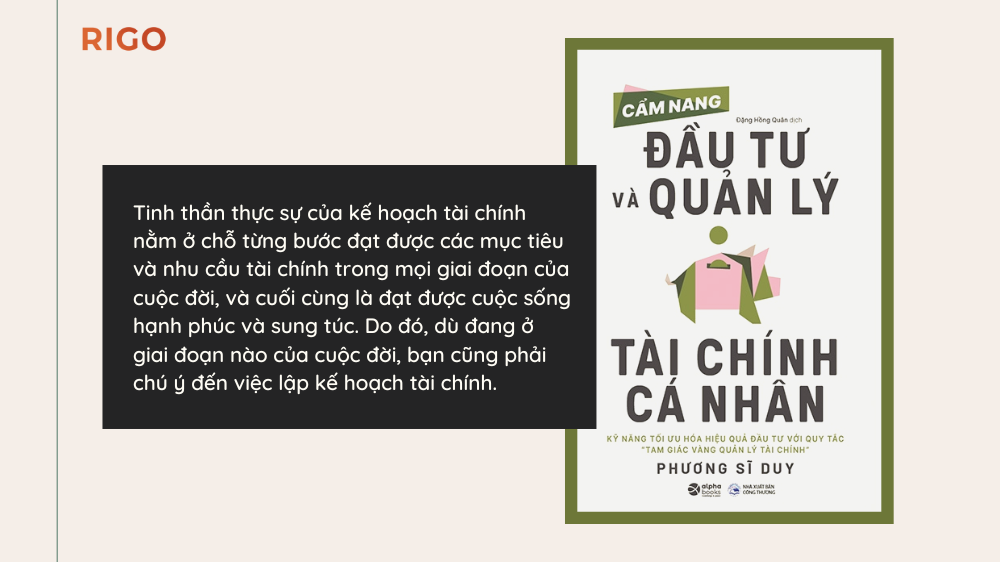 Tinh thần thực sự của kế hoạch tài chính nằm ở chỗ từng bước đạt được các mục tiêu và nhu cầu tài chính trong mọi giai đoạn của cuộc đời, và cuối cùng là đạt được cuộc sống hạnh phúc và sung túc. Do đó, dù đang ở giai đoạn nào của cuộc đời, bạn cũng phải chú ý đến việc lập kế hoạch tài chính.