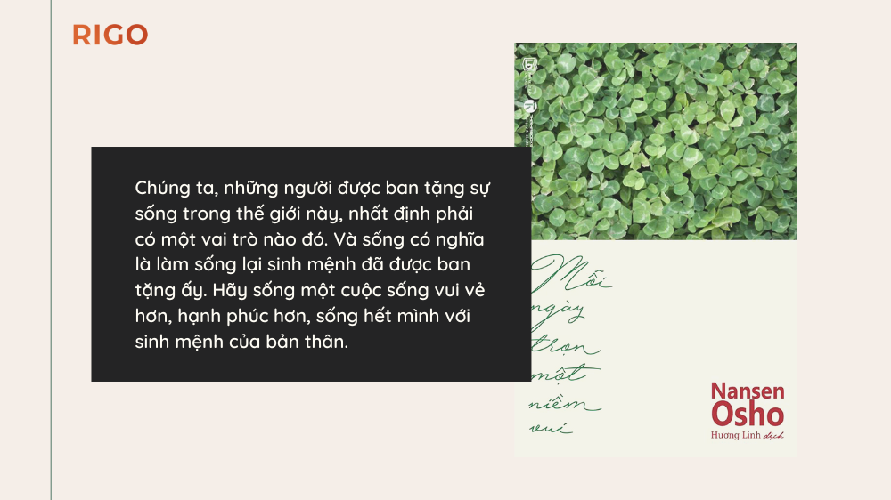 Chúng ta, những người được ban tặng sự sống trong thế giới này, nhất định phải có một vai trò nào đó. Và sống có nghĩa là làm sống lại sinh mệnh đã được ban tặng ấy. Hãy sống một cuộc sống vui vẻ hơn, hạnh phúc hơn, sống hết mình với sinh mệnh của bản thân.