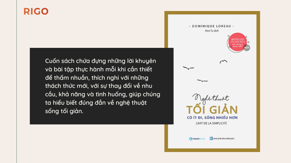 Cuốn sách chứa đựng những lời khuyên và bài tập thực hành mỗi khi cần thiết để thấm nhuần, thích nghi với những thách thức mới, với sự thay đổi về nhu cầu, khả năng và tình huống, giúp chúng ta hiểu biết đúng đắn về nghệ thuật sống tối giản.