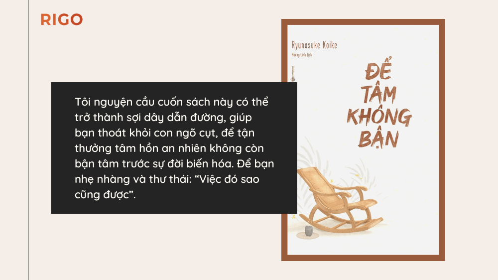 Tôi nguyện cầu cuốn sách này có thể trở thành sợi dây dẫn đường, giúp bạn thoát khỏi con ngõ cụt, để tận thưởng tâm hồn an nhiên không còn bận tâm trước sự đời biến hóa. Để bạn nhẹ nhàng và thư thái: “Việc đó sao cũng được”.