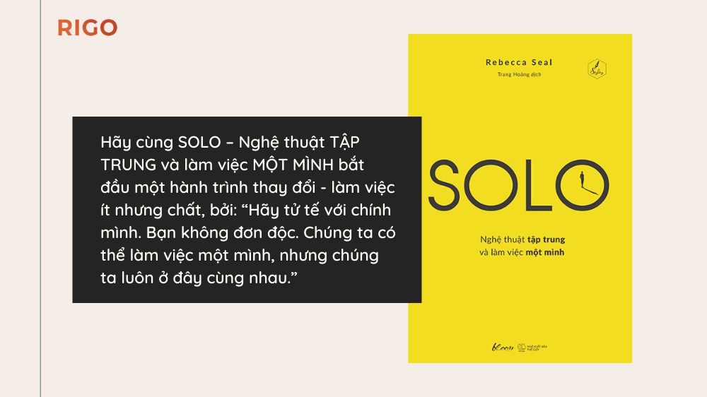 Hãy cùng SOLO – Nghệ thuật TẬP TRUNG và làm việc MỘT MÌNH bắt đầu một hành trình thay đổi – làm việc ít nhưng chất, bởi: “Hãy tử tế với chính mình. Bạn không đơn độc. Chúng ta có thể làm việc một mình, nhưng chúng ta luôn ở đây cùng nhau.”