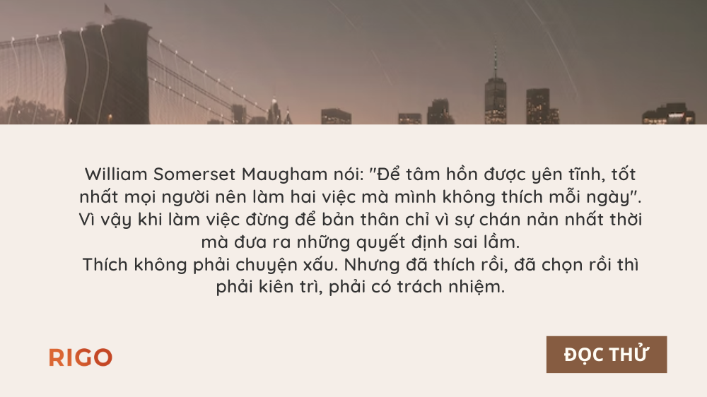 William Somerset Maugham nói: “Để tâm hồn được yên tĩnh, tốt nhất mọi người nên làm hai việc mà mình không thích mỗi ngày”. Vì vậy khi làm việc đừng để bản thân chỉ vì sự chán nản nhất thời mà đưa ra những quyết định sai lầm. Thích không phải chuyện xấu. Nhưng đã thích rồi, đã chọn rồi thì phải kiên trì, phải có trách nhiệm.
