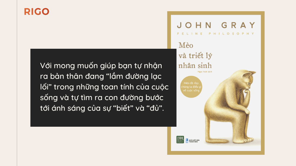 Cuốn sách cho chúng ta một cái nhìn so sánh về cuộc đời của loài mèo và cuộc đời loài người, từ đó để bạn tự nhận ra bản thân đang “lầm đường lạc lối” trong những toan tính của cuộc sống và tự tìm ra con đường bước tới ánh sáng của sự “biết” và “đủ”.