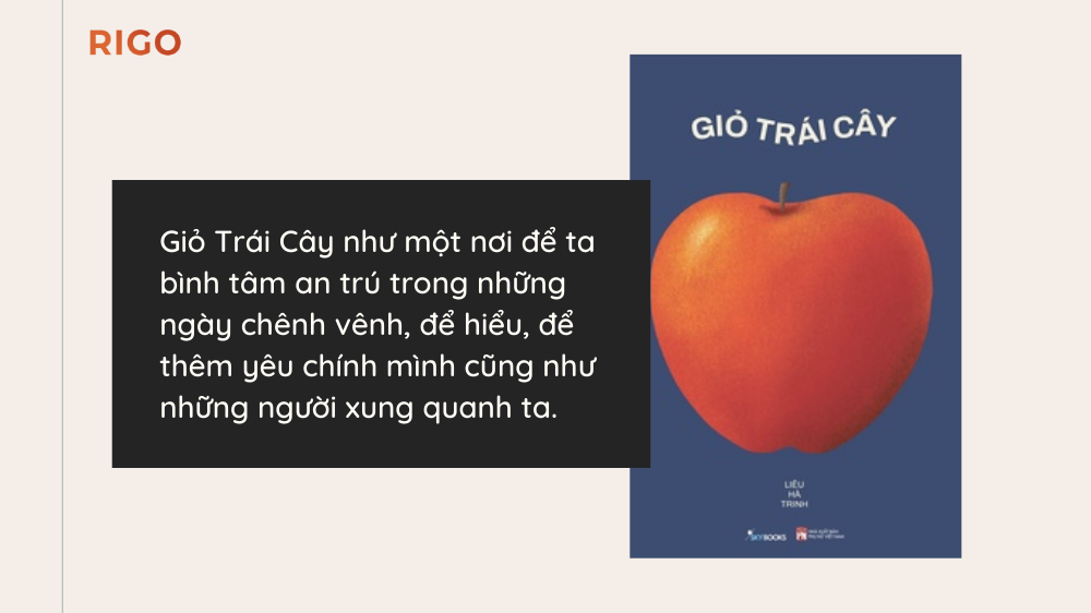 Với 158 trang viết gồm tản văn và lời thơ, Giỏ trái cây như một nơi để ta bình tâm an trú trong những ngày chênh vênh, để hiểu, để thêm yêu chính mình cũng như những người xung quanh ta.