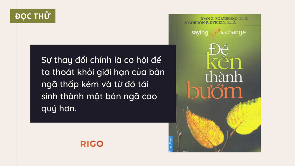 Cũng giống như sự thay đổi suốt quá trình chuyển hoá diệu kì của loài sâu buớm trong lớp vỏ kén để trở thành một cánh bướm rực rỡ sắc màu, sự thay đổi chính là cơ hội để ta thoát khỏi giới hạn của bản ngã thấp kém và từ đó tái sinh thành một bản ngã cao quý hơn.