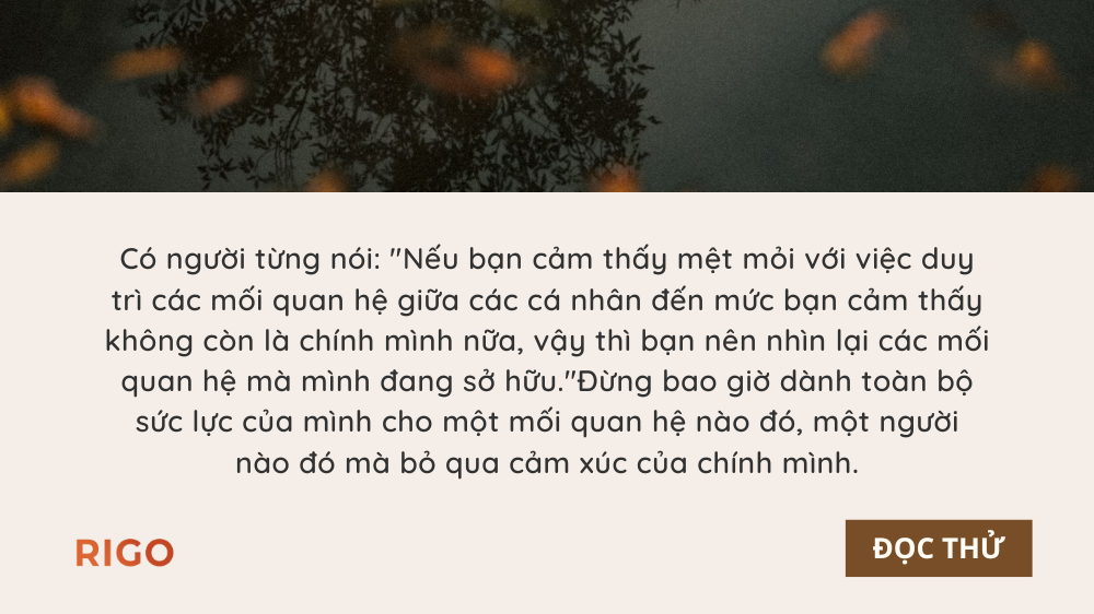 Có người từng nói: “Nếu bạn cảm thấy mệt mỏi với việc duy trì các mối quan hệ giữa các cá nhân đến mức bạn cảm thấy không còn là chính mình nữa, vậy thì bạn nên nhìn lại các mối quan hệ mà mình đang sở hữu.” Tôi đồng ý sâu sắc với điều này. Đừng bao giờ dành toàn bộ sức lực của mình cho một mối quan hệ nào đó, một người nào đó mà bỏ qua cảm xúc của chính mình.