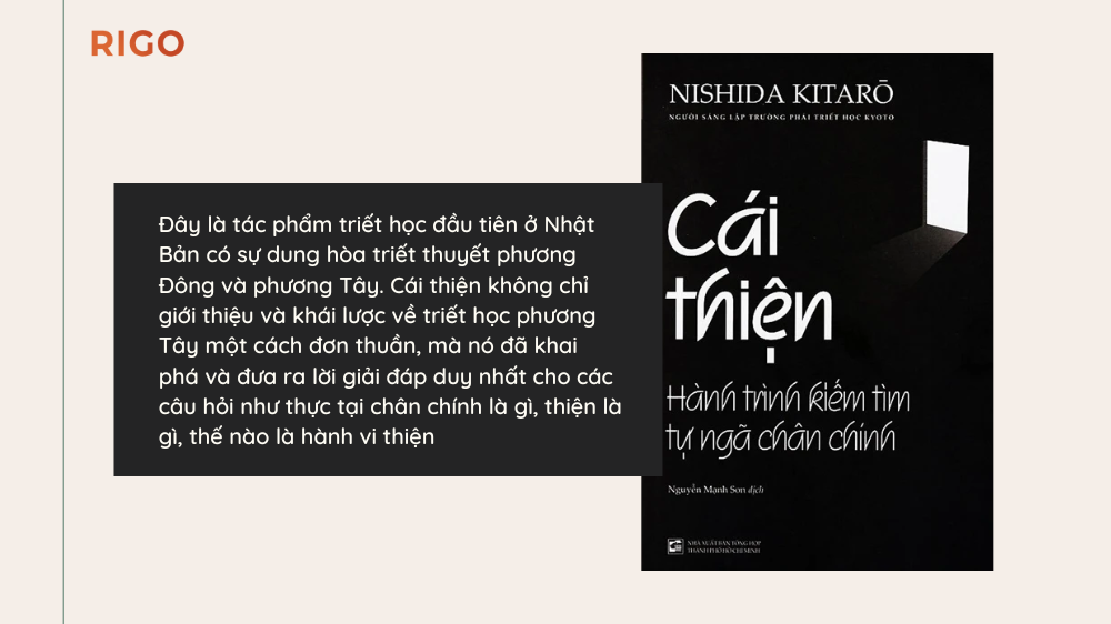 Đây là tác phẩm triết học đầu tiên ở Nhật Bản có sự dung hòa triết thuyết phương Đông và phương Tây. Cái thiện không chỉ giới thiệu và khái lược về triết học phương Tây một cách đơn thuần, mà nó đã khai phá và đưa ra lời giải đáp duy nhất cho các câu hỏi như thực tại chân chính là gì, thiện là gì, thế nào là hành vi thiện
