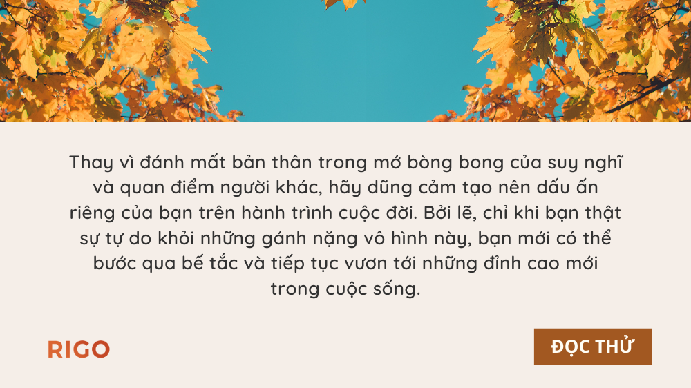Thay vì đánh mất bản thân trong mớ bòng bong của suy nghĩ và quan điểm người khác, hãy dũng cảm tạo nên dấu ấn riêng của bạn trên hành trình cuộc đời. Bởi lẽ, chỉ khi bạn thật sự tự do khỏi những gánh nặng vô hình này, bạn mới có thể bước qua bế tắc và tiếp tục vươn tới những đỉnh cao mới trong cuộc sống.