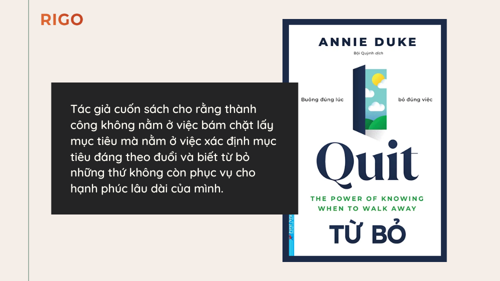 Tác giả cuốn sách cho rằng thành công không nằm ở việc bám chặt lấy mục tiêu mà nằm ở việc xác định mục tiêu đáng theo đuổi và biết từ bỏ những thứ không còn phục vụ cho hạnh phúc lâu dài của mình.