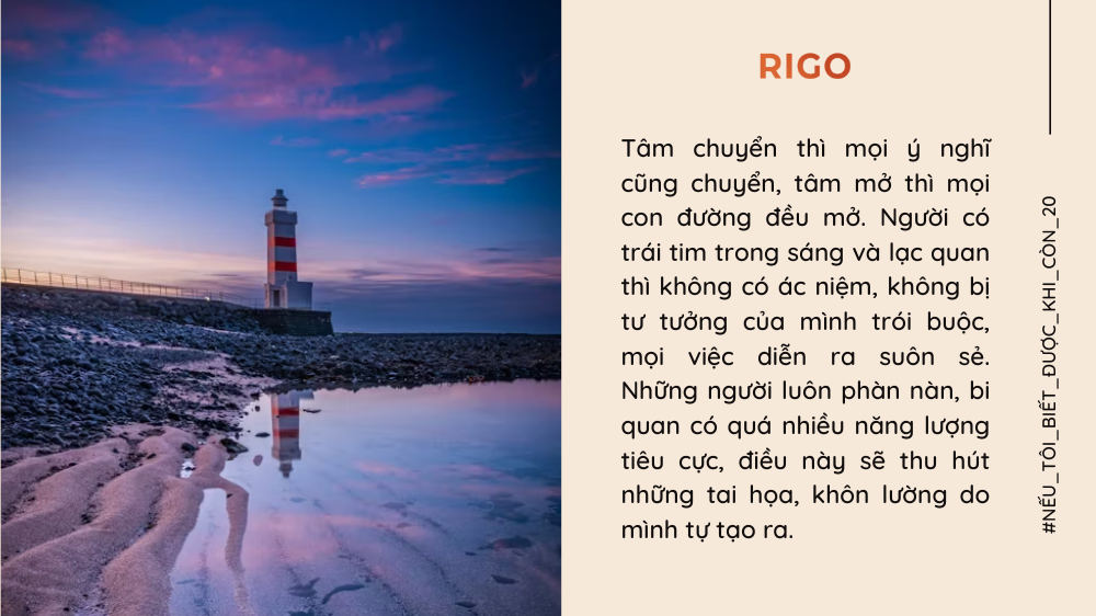 Tâm chuyển thì mọi ý nghĩ cũng chuyển, tâm mở thì mọi con đường đều mở. Người có trái tim trong sáng và lạc quan thì không có ác niệm, không bị tư tưởng của mình trói buộc, mọi việc diễn ra suôn sẻ. Những người luôn phàn nàn, bi quan có quá nhiều năng lượng tiêu cực, điều này sẽ thu hút những tai họa, khôn lường do mình tự tạo ra.