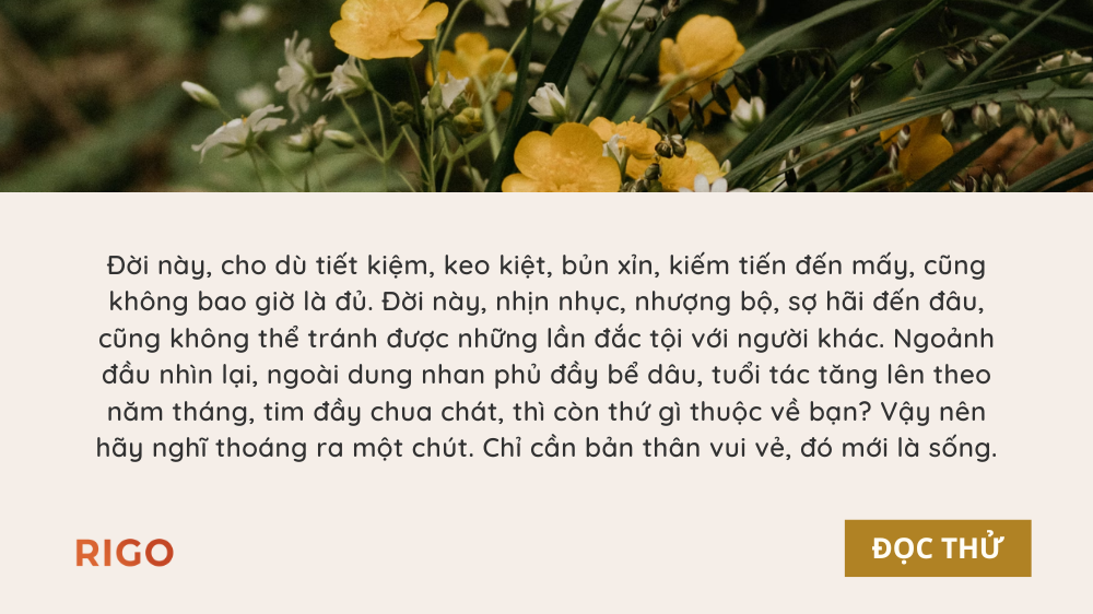 Đời này, cho dù tiết kiệm, keo kiệt, bủn xỉn, kiếm tiến đến mấy, cũng không bao giờ là đủ. Đời này, nhịn nhục, nhượng bộ, sợ hãi đến đâu, cũng không thể tránh được những lần đắc tội với người khác. Ngoảnh đầu nhìn lại, ngoài dung nhan phủ đầy bể dâu, tuổi tác tăng lên theo năm tháng, tim đầy chua chát, thì còn thứ gì thuộc về bạn? Vậy nên hãy nghĩ thoáng ra một chút. Chỉ cần bản thân vui vẻ, đó mới là sống.