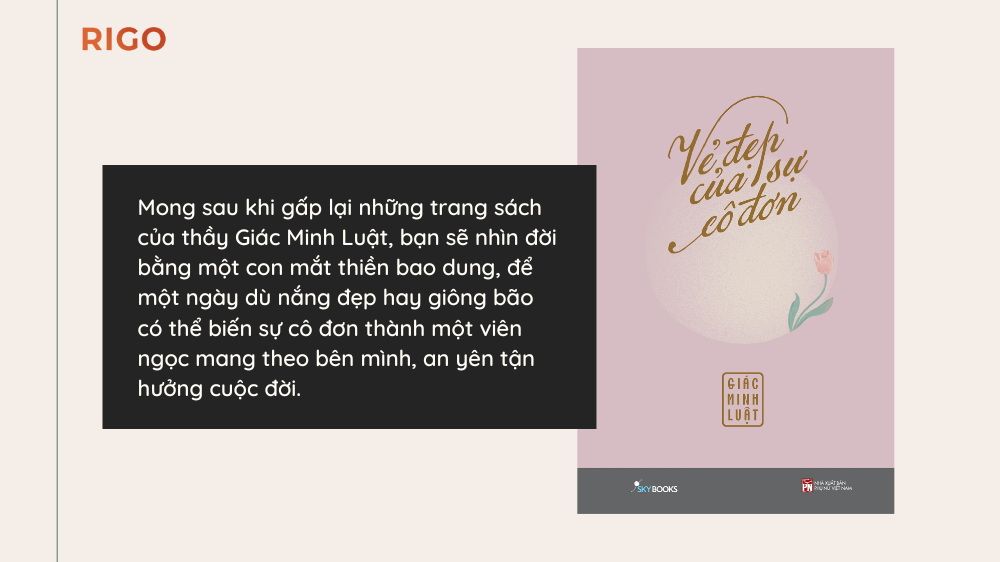 Mong sau khi gấp lại những trang sách của thầy Giác Minh Luật, bạn sẽ nhìn đời bằng một con mắt thiền bao dung, để một ngày dù nắng đẹp hay giông bão có thể biến sự cô đơn thành một viên ngọc mang theo bên mình, an yên tận hưởng cuộc đời.