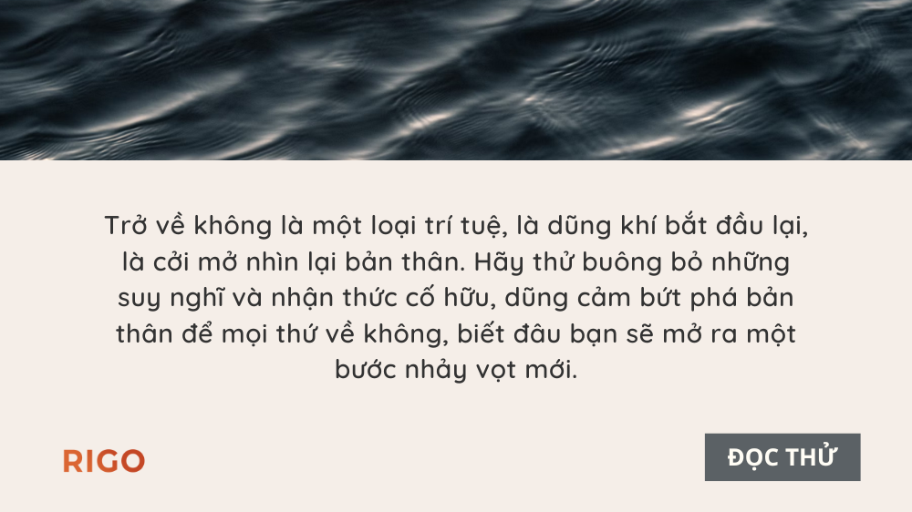 Trở về không là một loại trí tuệ, là dũng khí bắt đầu lại, là cởi mở nhìn lại bản thân. Hãy thử buông bỏ những suy nghĩ và nhận thức cố hữu, dũng cảm bứt phá bản thân để mọi thứ về không, biết đâu bạn sẽ mở ra một bước nhảy vọt mới.