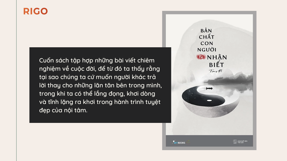 Cuốn sách tập hợp những bài viết chiêm nghiệm về cuộc đời, để từ đó ta thấy rằng tại sao chúng ta cứ muốn người khác trả lời thay cho những lăn tăn bên trong mình, trong khi ta có thể lắng đọng, khơi dòng và tĩnh lặng ra khơi trong hành trình tuyệt đẹp của nội tâm.
