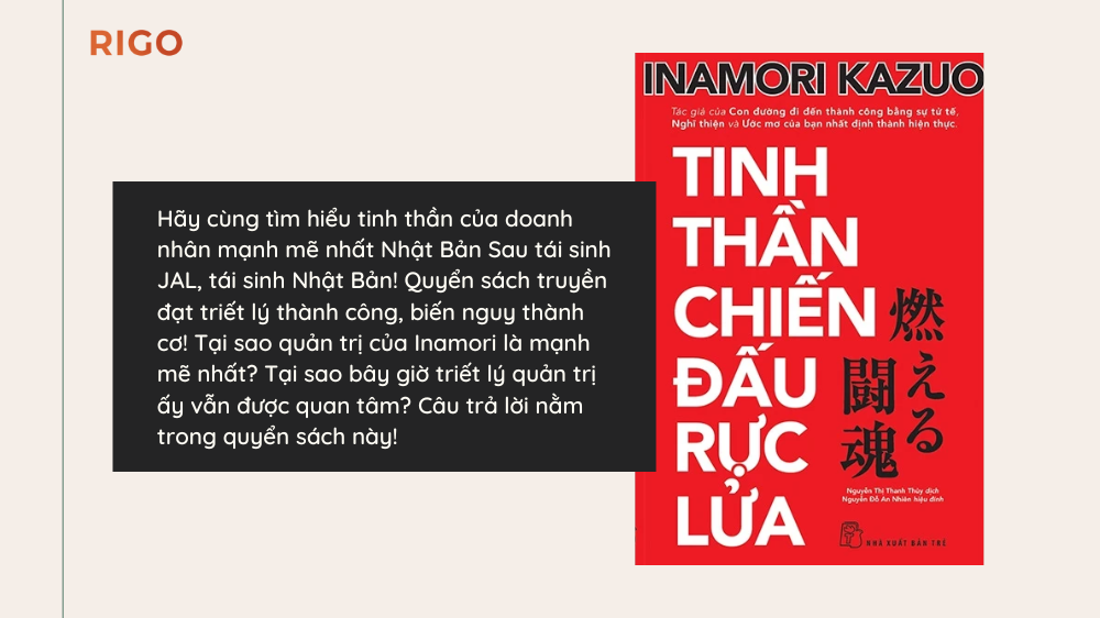 Hãy cùng tìm hiểu tinh thần của doanh nhân mạnh mẽ nhất Nhật Bản Sau tái sinh JAL, tái sinh Nhật Bản! Quyển sách truyền đạt triết lý thành công, biến nguy thành cơ! Tại sao quản trị của Inamori là mạnh mẽ nhất? Tại sao bây giờ triết lý quản trị ấy vẫn được quan tâm? Câu trả lời nằm trong quyển sách này!