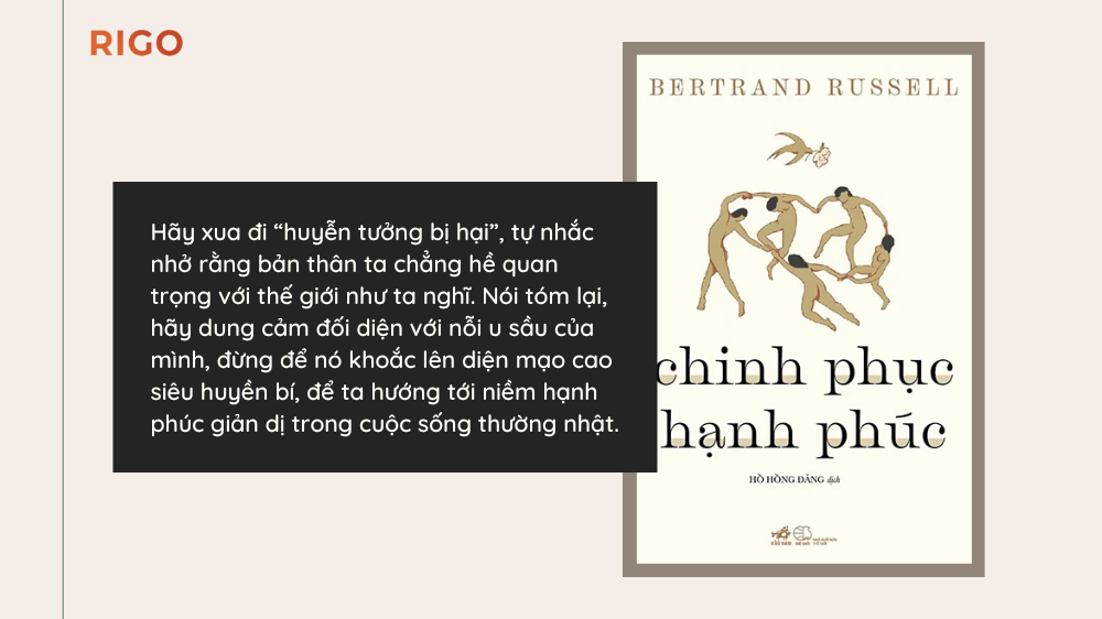 Hãy xua đi “huyễn tưởng bị hại”, tự nhắc nhở rằng bản thân ta chẳng hề quan trọng với thế giới như ta nghĩ. Nói tóm lại, hãy dung cảm đối diện với nỗi u sầu của mình, đừng để nó khoắc lên diện mạo cao siêu huyền bí, để ta hướng tới niềm hạnh phúc giản dị trong cuộc sống thường nhật.