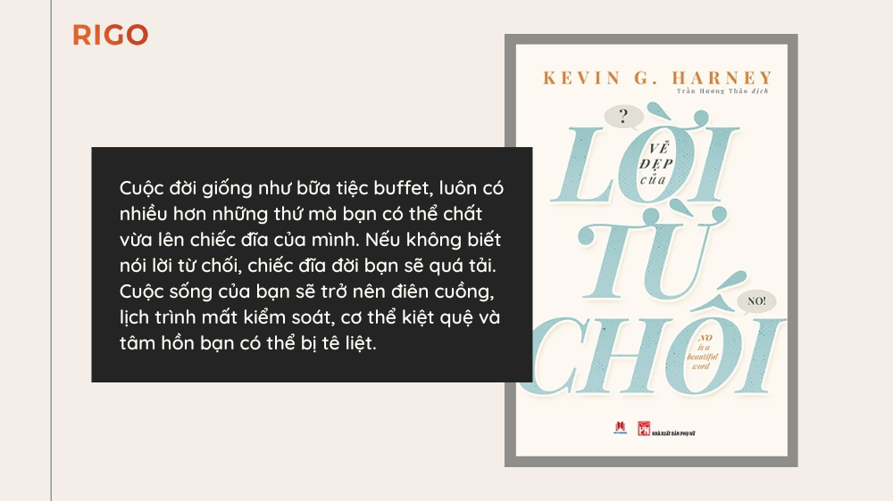 Cuộc đời giống như bữa tiệc buffet, luôn có nhiều hơn những thứ mà bạn có thể chất vừa lên chiếc đĩa của mình. Nếu không biết nói lời từ chối, chiếc đĩa đời bạn sẽ quá tải. Cuộc sống của bạn sẽ trở nên điên cuồng, lịch trình mất kiểm soát, cơ thể kiệt quệ và tâm hồn bạn có thể bị tê liệt.