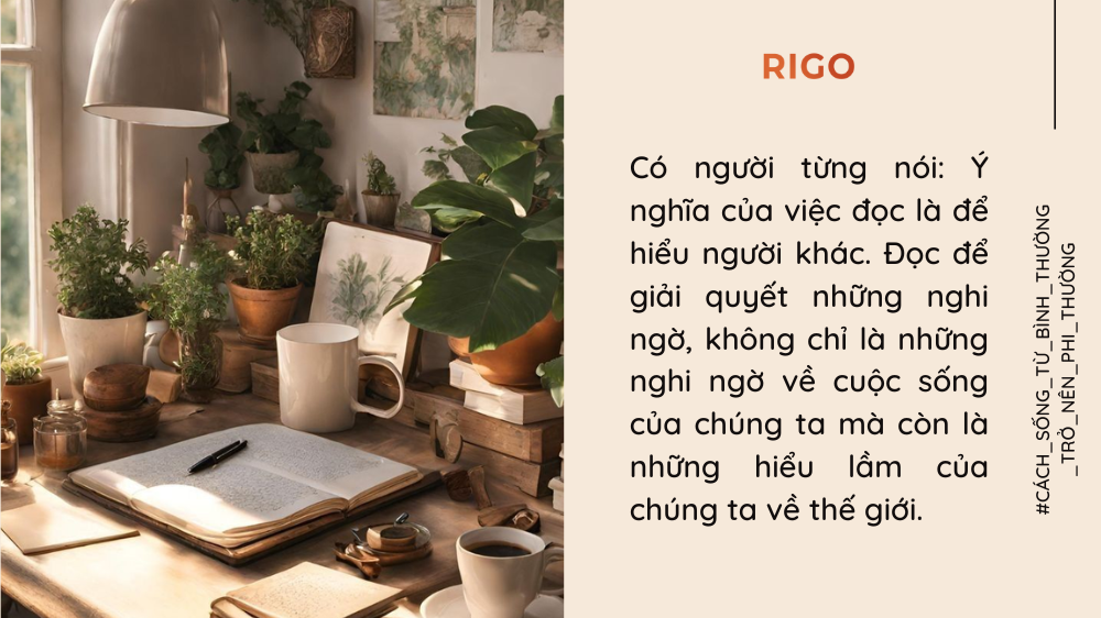Đọc sách không phải để kiếm lợi, cũng không phải là tấm danh thiếp để trang trí cho bản thân, mà là cung cấp chất dinh dưỡng cho tâm hồn. Đọc sách không làm bạn giàu có nhưng có thể khiến bạn sống một cuộc sống đầy đủ và tiệm cận đến cái tôi thật sự.