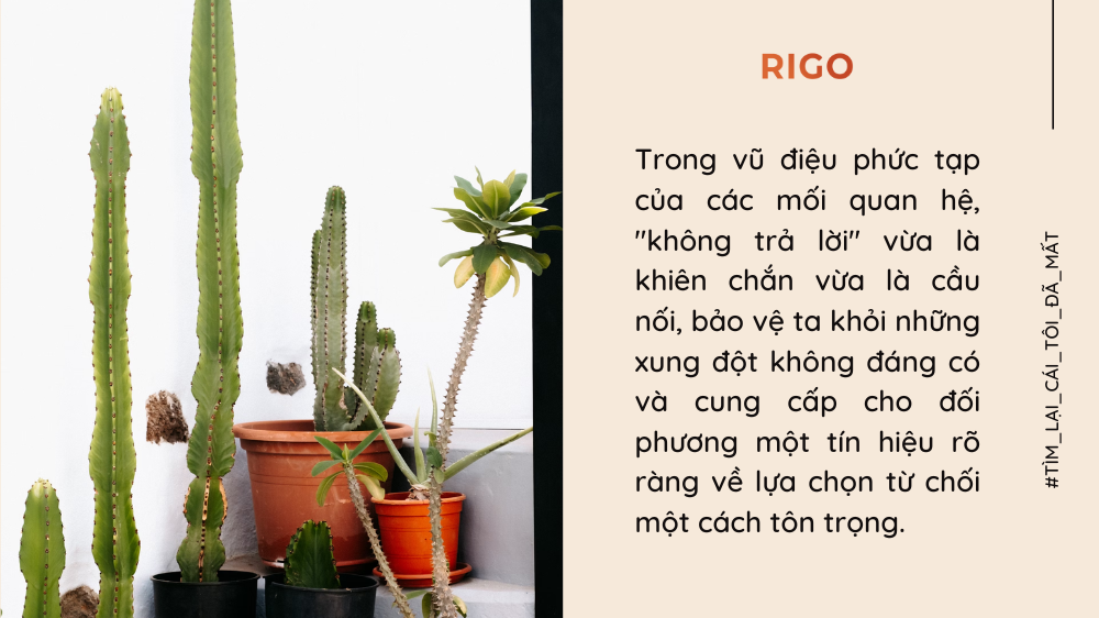 Với ba từ mạnh mẽ này, chúng ta không chỉ thể hiện sự dũng cảm trong việc đặt ra ranh giới mà còn bảo toàn sự hoà hợp từ xa, cho phép mỗi người tự do và độc lập trong không gian riêng tư của mình. Đó không hề là sự thờ ơ, mà là bản lĩnh của một phong cách sống trưởng thành, minh mẫn, giúp chúng ta điều khiển con thuyền của mình qua dòng đời bằng sự bình thản và chủ động.