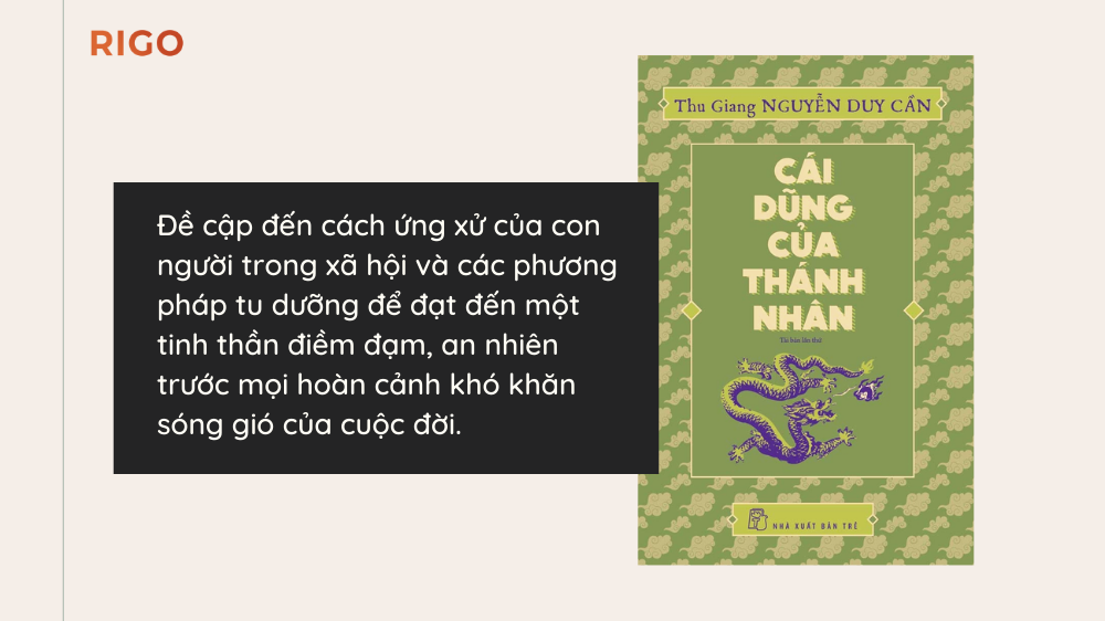 Cái Dũng Của Thánh Nhân bàn về cách đối nhân xử thế của con người trong xã hội. Và những phương pháp để tu thân dưỡng tính, hình thành tính cách điềm đạm, an yên trước mọi hoàn cảnh khốn cùng của cuộc đời.