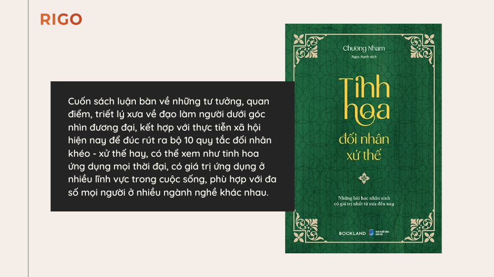 Cuốn sách luận bàn về những tư tưởng, quan điểm, triết lý xưa về đạo làm người dưới góc nhìn đương đại, kết hợp với thực tiễn xã hội hiện nay để đúc rút ra bộ 10 quy tắc đối nhân khéo – xử thế hay, có thể xem như tinh hoa ứng dụng mọi thời đại, có giá trị ứng dụng ở nhiều lĩnh vực trong cuộc sống, phù hợp với đa số mọi người ở nhiều ngành nghề khác nhau.
