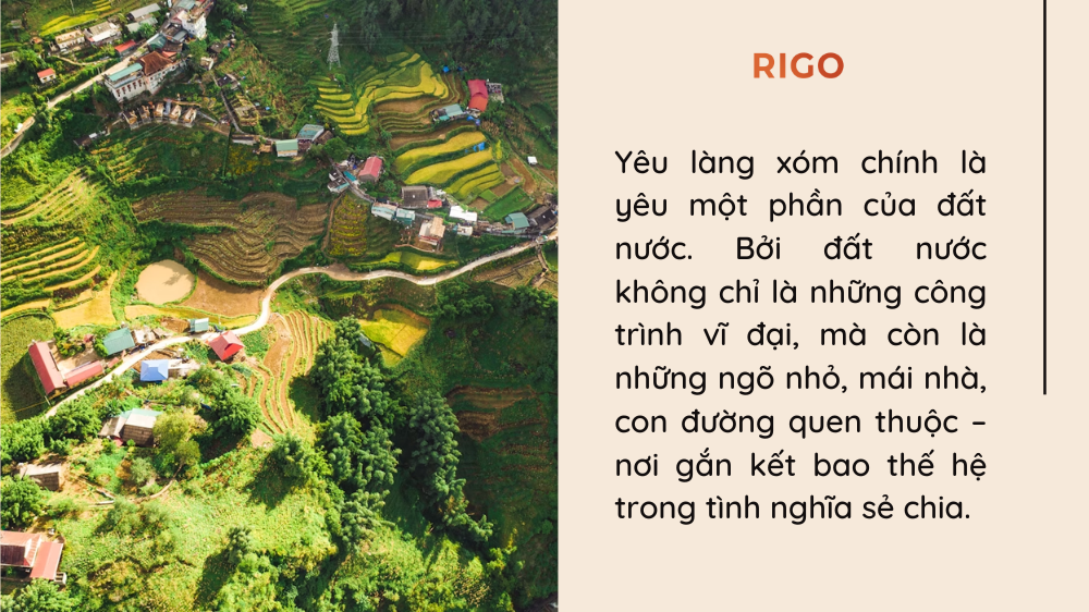 Yêu làng xóm chính là yêu một phần của đất nước. Bởi đất nước không chỉ là những công trình vĩ đại, mà còn là những ngõ nhỏ, mái nhà, con đường quen thuộc – nơi gắn kết bao thế hệ trong tình nghĩa sẻ chia.