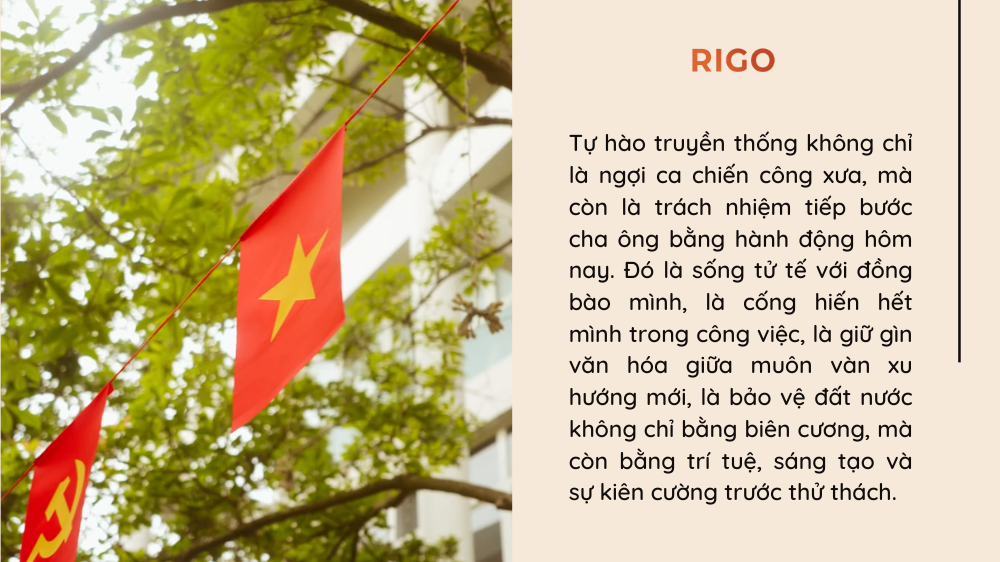 Tự hào truyền thống không chỉ là ngợi ca chiến công xưa, mà còn là trách nhiệm tiếp bước cha ông bằng hành động hôm nay. Đó là sống tử tế với đồng bào mình, là cống hiến hết mình trong công việc, là giữ gìn văn hóa giữa muôn vàn xu hướng mới, là bảo vệ đất nước không chỉ bằng biên cương, mà còn bằng trí tuệ, sáng tạo và sự kiên cường trước thử thách.