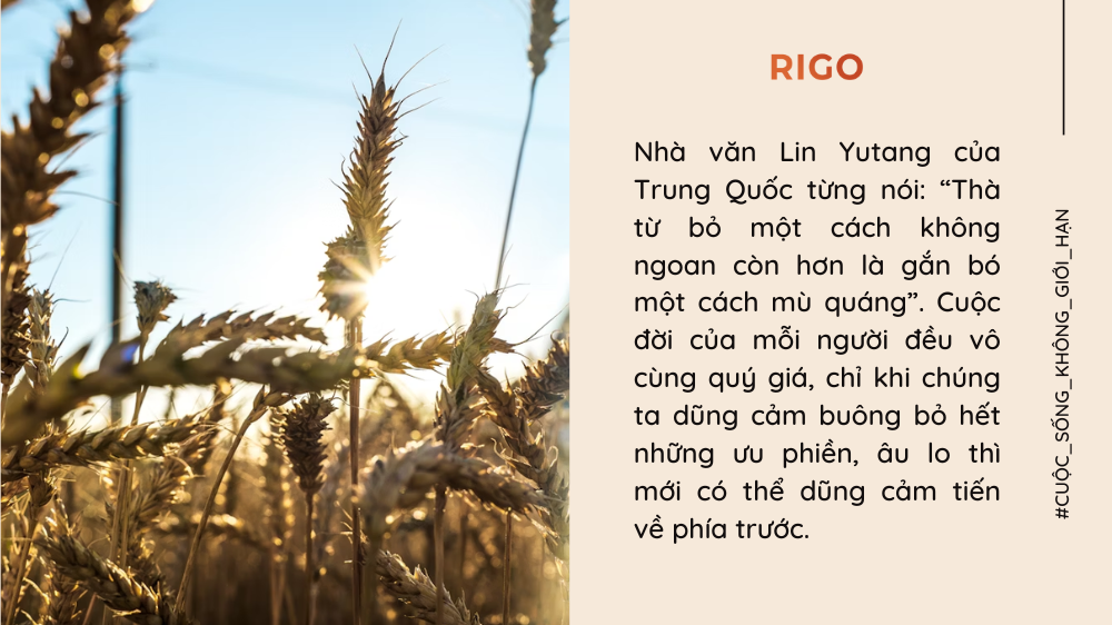Nhà văn Lin Yutang của Trung Quốc từng nói: “Thà từ bỏ một cách không ngoan còn hơn là gắn bó một cách mù quáng”. Cuộc đời của mỗi người đều vô cùng quý giá, chỉ khi chúng ta dũng cảm buông bỏ hết những ưu phiền, âu lo thì mới có thể dũng cảm tiến về phía trước.