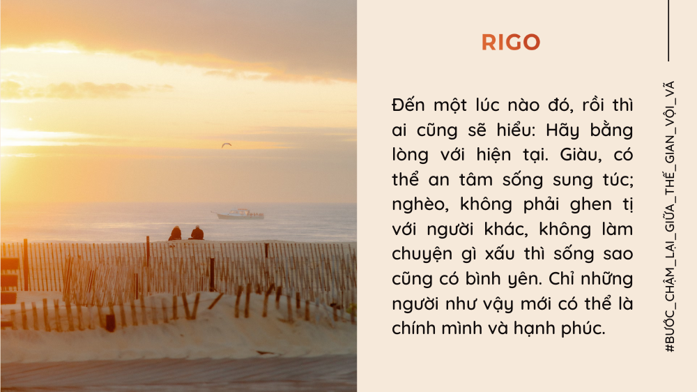 Hãy bằng lòng với hiện tại. Giàu, có thể an tâm sống sung túc; nghèo, không phải ghen tị với người khác, không làm chuyện gì xấu thì sống sao cũng có bình yên. Chỉ những người như vậy mới có thể là chính mình và hạnh phúc.