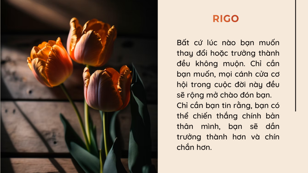 Bất cứ lúc nào bạn muốn thay đổi hoặc trưởng thành đều không muộn. Chỉ cần bạn muốn, mọi cánh cửa cơ hội trong cuộc đời này đều sẽ rộng mở chào đón bạn. Chỉ cần bạn tin rằng, bạn có thể chiến thắng chính bản thân mình, bạn sẽ dần trưởng thành hơn và chín chắn hơn.
