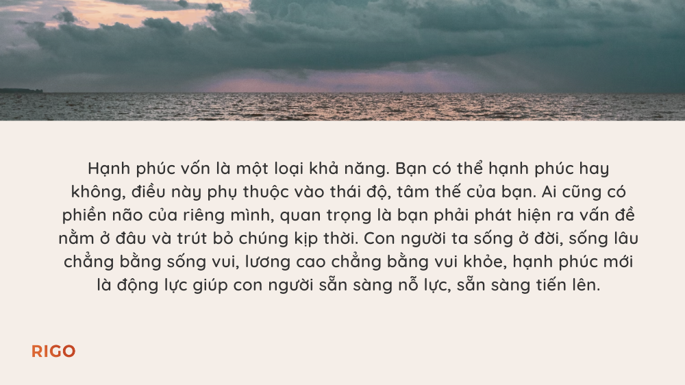 Hạnh phúc vốn là một loại khả năng. Bạn có thể hạnh phúc hay không, điều này phụ thuộc vào thái độ, tâm thế của bạn. Ai cũng có phiền não của riêng mình, quan trọng là bạn phải phát hiện ra vấn đề nằm ở đâu và trút bỏ chúng kịp thời. Con người ta sống ở đời, sống lâu chẳng bằng sống vui, lương cao chẳng bằng vui khỏe, hạnh phúc mới là động lực giúp con người sẵn sàng nỗ lực, sẵn sàng tiến lên.