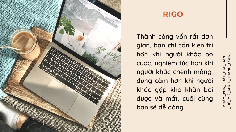 Thành công vốn rất đơn giản, bạn chỉ cần kiên trì hơn khi người khác bỏ cuộc, nghiêm túc hơn khi người khác chểnh mảng, dung cảm hơn khi người khác gặp khó khăn bởi được và mất, cuối cùng bạn sẽ dễ dàng.
